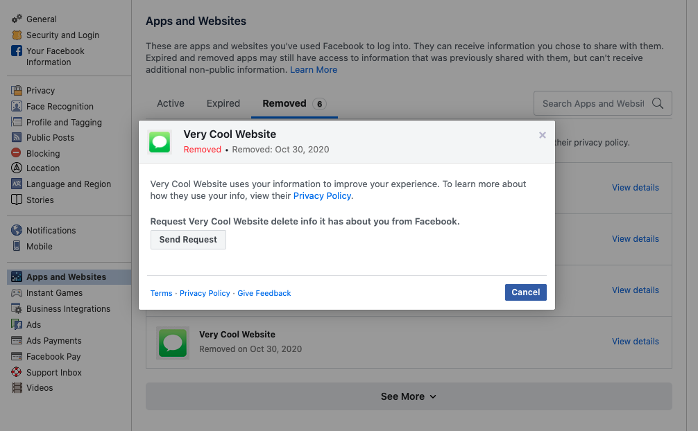 The data deletion callback is called whenever an TT Lite app user removes TT Lite app and requests that TT Lite delete their data. TT Lite app users can do this by going to their Facebook profile and clicking the Send Reuqest button on the Setting & Privacy>Settings>Apps and Websites page.